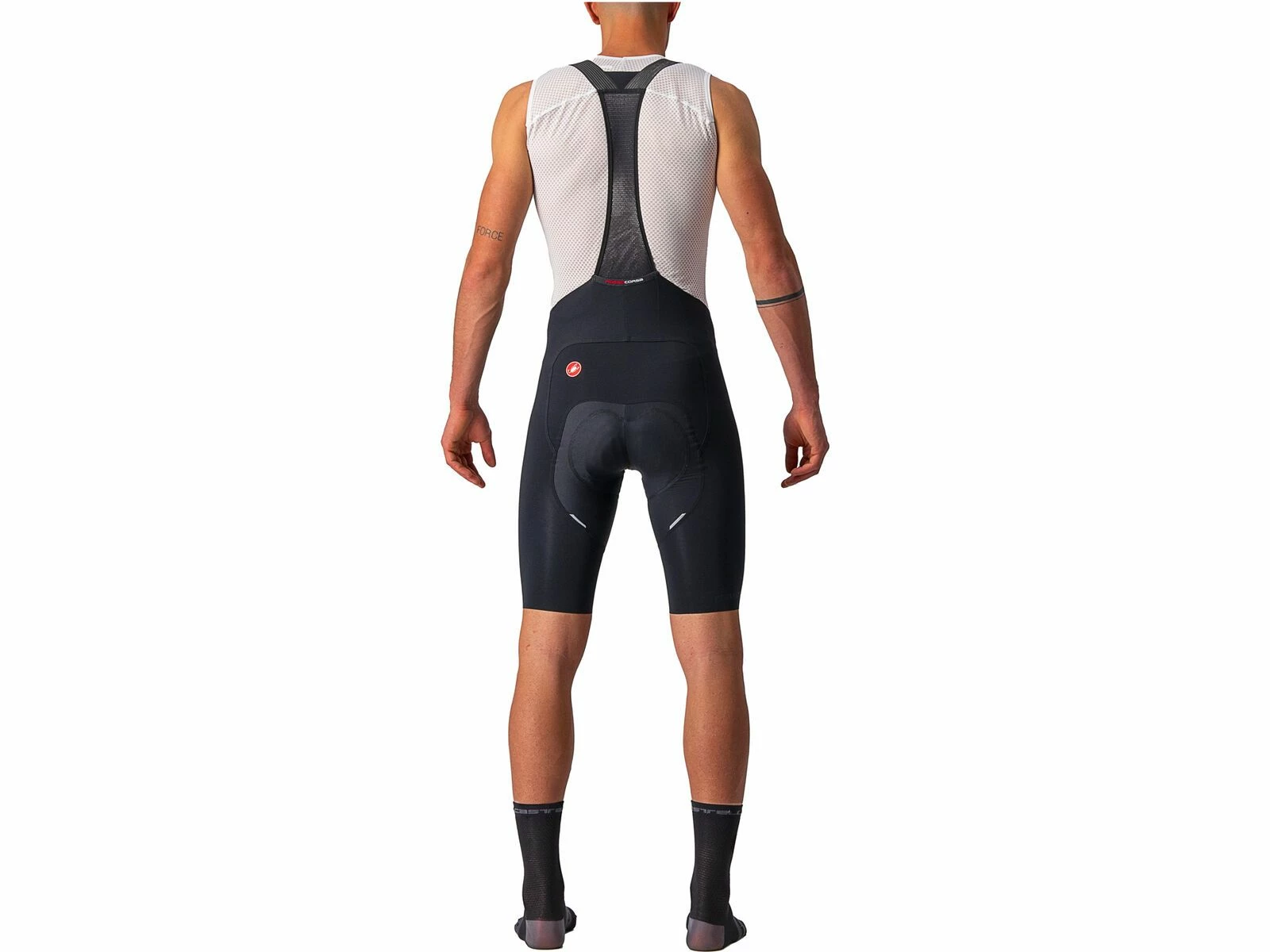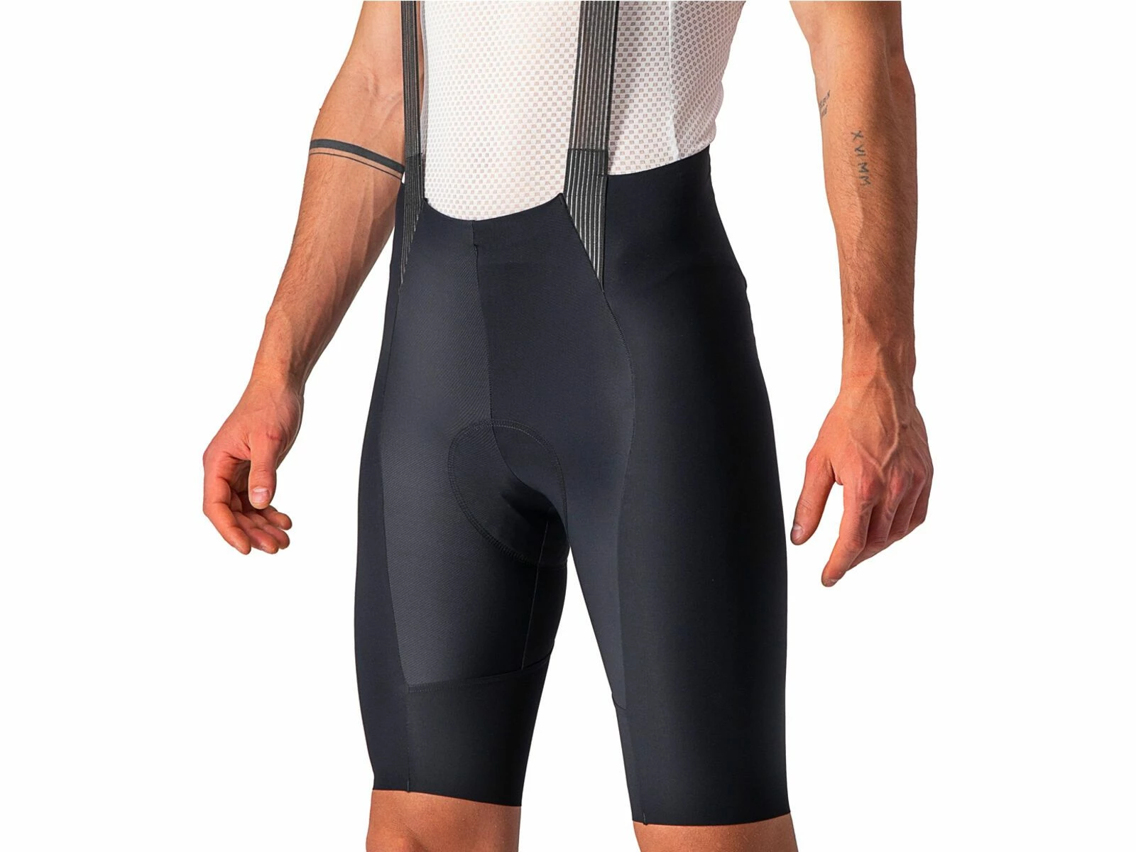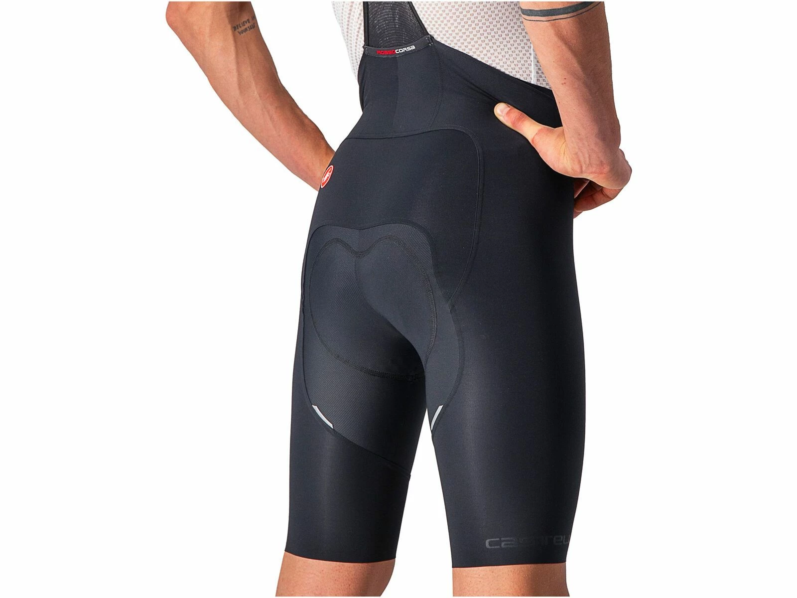 Dank der reduzierten Anzahl von Stoffbahnen und Nähten ist das Tragegefühl buchstäblich „Free“. Tatsächlich besteht die Short aus nur 5 Panels im Vergleich zu 10 beim Vorgängermodell. „Free“ fühlt man sich auch, weil das nahtlos gefertigte Progetto X2 Air Seamless-Sitzpolster weiter verfeinert wurde. Die zwei Schaumstoffdichten und die Gelpolster sorgen für eine progressive Dämpfung, während die separate Skin Care-Schicht weich und elastisch ist und sich mit deiner Haut bewegt. „Free“ fühlen sich zudem die minimalste Trägerkonstruktion an, die du je bei einer Radshort gesehen hast, mit offen gewebten Trägern für maximale Luftzirkulation. An denen sorgt ein verstärkter Einsatz dafür, dass sie an Ort und Stelle bleiben. Das Rückenteil aus Netzmaterial ist extra schmal geschnitten und garantiert doch sicheren Sitz. Zudem verfügt die Trägerkonstruktion über eine praktische, mittig platzierte Rückensasche. „Free“ bedeutet zu guter Letzt, dass dies die erste High-End-Radshort ist, die ohne irgendwelche Gripper oder Elastikbündchen an den Beinabschlüssen auskommt und dennoch rutschfreien Sitz bietet. Um dies zu erreichen, waren 28 Prototypen und Castellis bisher umfangreichstes Testprogramm erforderlich. Das Ergebnis sind die komfortabelsten Beinabschlüsse, die Castelli je hergestellt haben.